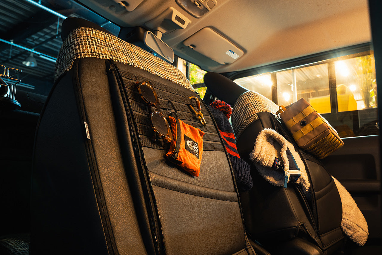 Boasting a classic houndstooth pattern, THE GEAR seat covers also feature a Molle storage facility on the rear, allowing you to attach various accessories (such as our range of Molle Pouches). Various other items can also be stored in the zip-up storage compartments, or in the storage pocket on the rear of each seat cover.